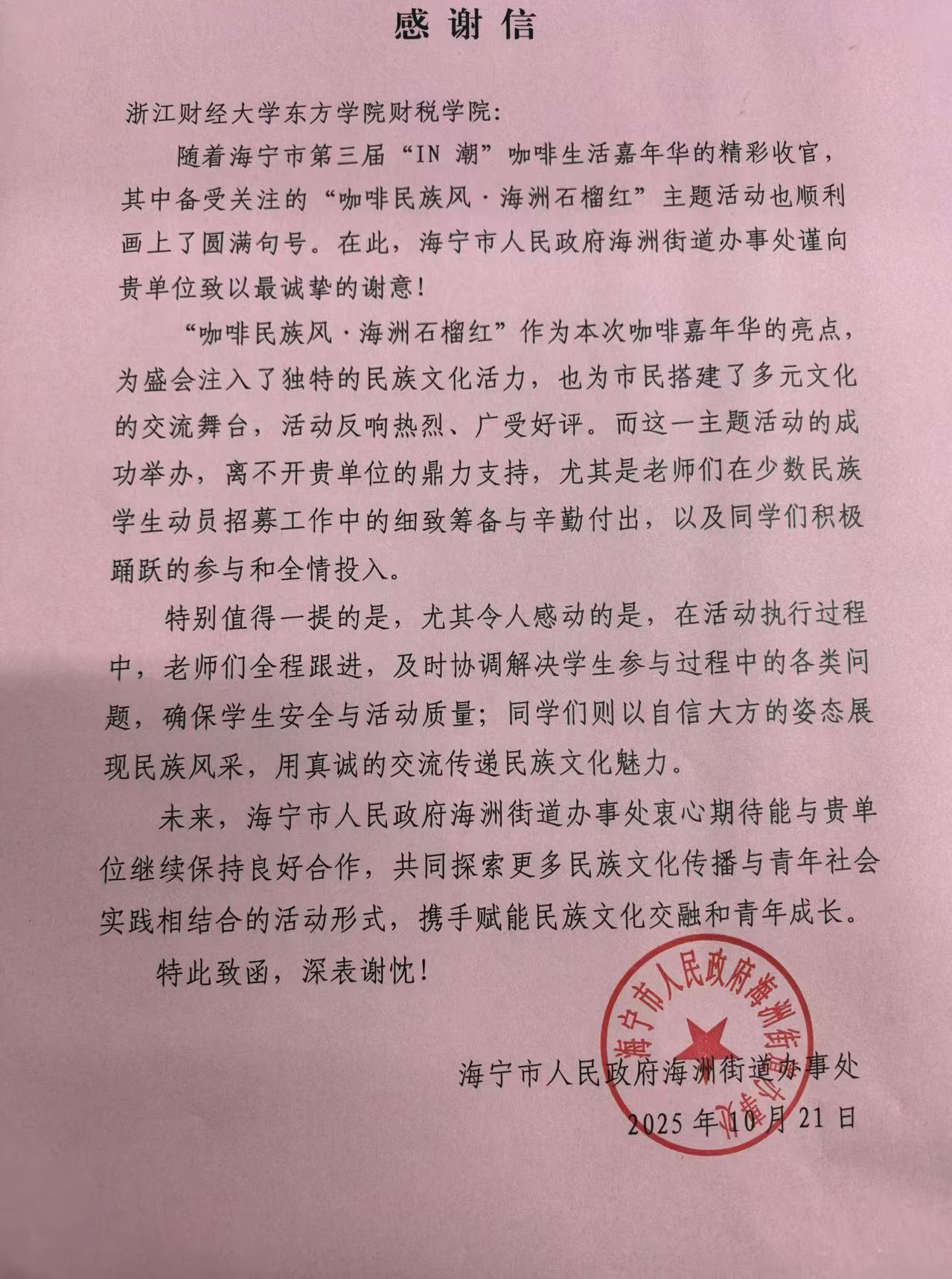 近日,海宁市人民政府海洲街道办事处向浙江财经大学东方学院ok138cn太阳集团古天乐发来感谢信,对我院师生在海宁市第三届“IN潮”咖啡生活嘉年华之“咖啡民族风·海洲石榴红”主题活动中的积极参与和大力支持表示高度肯定与诚挚感谢。