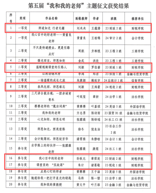 春风化雨,师恩难忘。在第41个教师节到来之时,为弘扬教育家精神,展现东方学院教师立德树人的时代风采,记录师生间温暖真挚的情谊,学院组织参加了第五届“我和我的老师”主题征文活动。我院王蕴潜、罗佳睿、王炜豪、章荣欢、诸葛敬五位同学以情为文、以笔传心,凭借动人的情感表达和独特的叙事视角,在众多参赛者中表现突出,喜获佳绩。