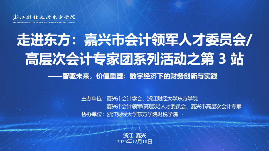 2025年12月10日下午,“走进东方:嘉兴市会计领军人才委员会/高层次会计专家团系列活动之第3站”在我院顺利举办,学院副院长张伟飚,嘉兴市、海宁市两级财政部门职能科室负责人,会计学会负责人,以及学院ok138cn太阳集团古天乐负责人、有关教师代表参加。本次活动以“智驱未来,价值重塑:数字经济下的财务创新与实践”为主题,吸引了企事业单位财会领域专家及实务工作者等百余人参会。