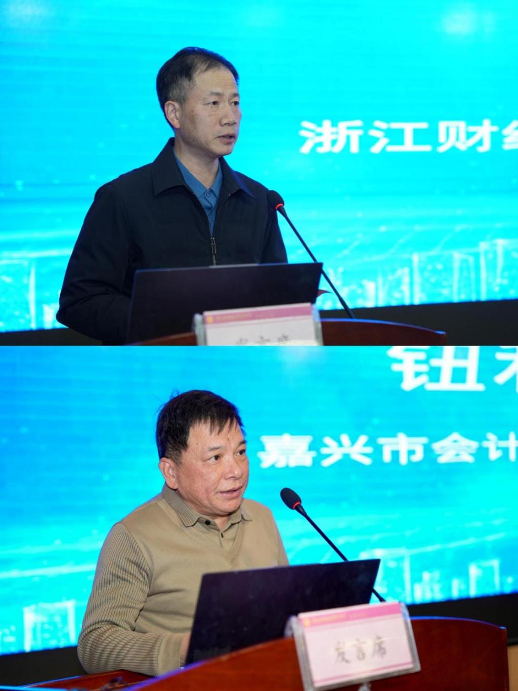 嘉兴市会计学会会长钮利根在致辞中回顾了系列活动从企业实践到高校理论的演进,强调此次活动是向“共创未来智慧”的战略深化。