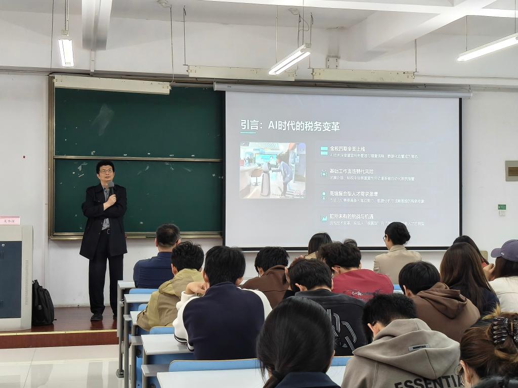 为帮助2025级税收专业学生明确学业目标,深化对人工智能时代税务职业发展的认知,2026年4月21日下午,我院特邀财税领域专家吴伟强老师,在6教205教室开展主题为“人工智能条件下税务专业的职业规划”的专业讲座,25税收专业(含专升本)全体学生到场参与学习,学院教师高伟华、朱计、崔红霞、陈希敏老师参加,讲座由郁晓教授主持。
